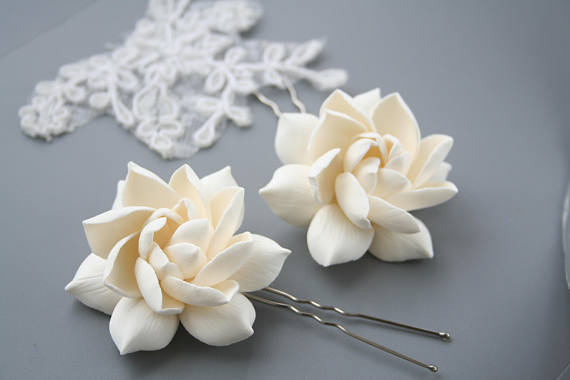 アカネ科の常緑低木に分類されるクチナシは、果実が生薬・漢方薬の原料になるが、身を着ける前の花はこんなに麗しくて、是非ともクレイフラワーで作りたくなる。そして今回は鼻だけではなくUピンを付けて、このように立派な髪飾りにした。